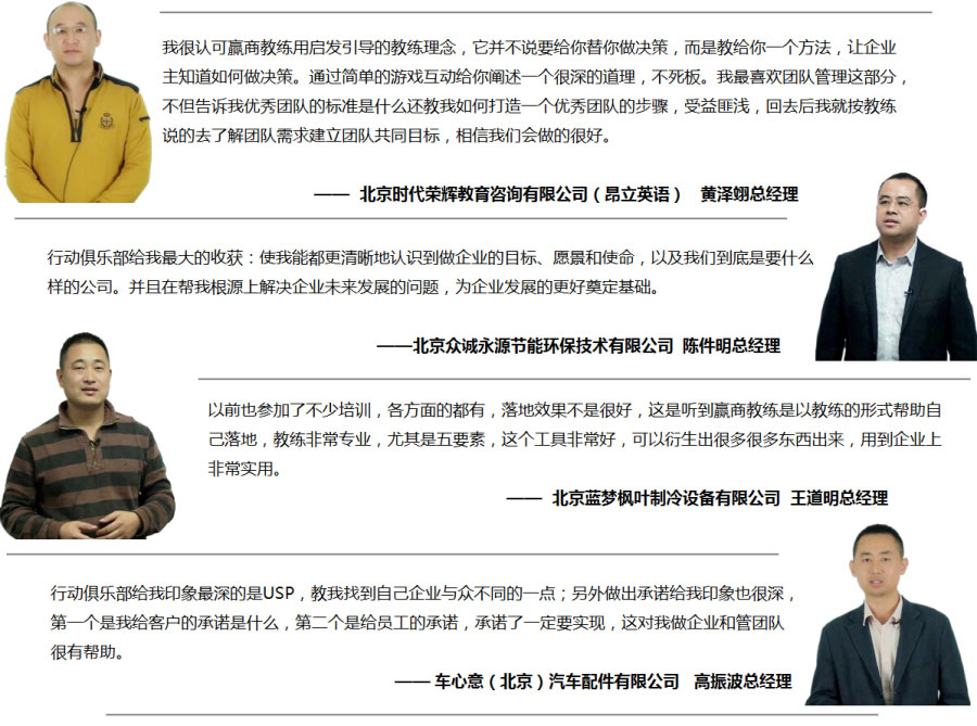 行动俱乐部是由赢商教练针对中小企业主进行的系统化集体辅导,主要从企业运营的6个方面帮助企业主获得更多现金流和利润的同时拥有充足的个人时间。行动俱乐部由在华最有实战经验的顶尖教练李莉、李旎、李君强强联手,共同担任主讲教练。